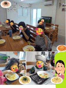 出来上がったパスタを食べて、友達同士で「おいしいね」「これ〇〇ちゃんが切ったやつ」「家でも作ってほしい」と会話も盛り上がり、美味しそうに食べていました😋🍝