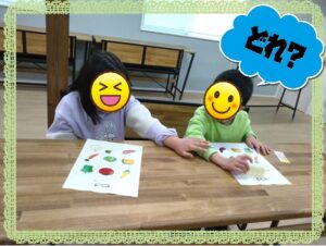 支援員が箱の中から野菜の名前のカードを引き名前だけを聞いて自分のカードにシールを貼ります☝️